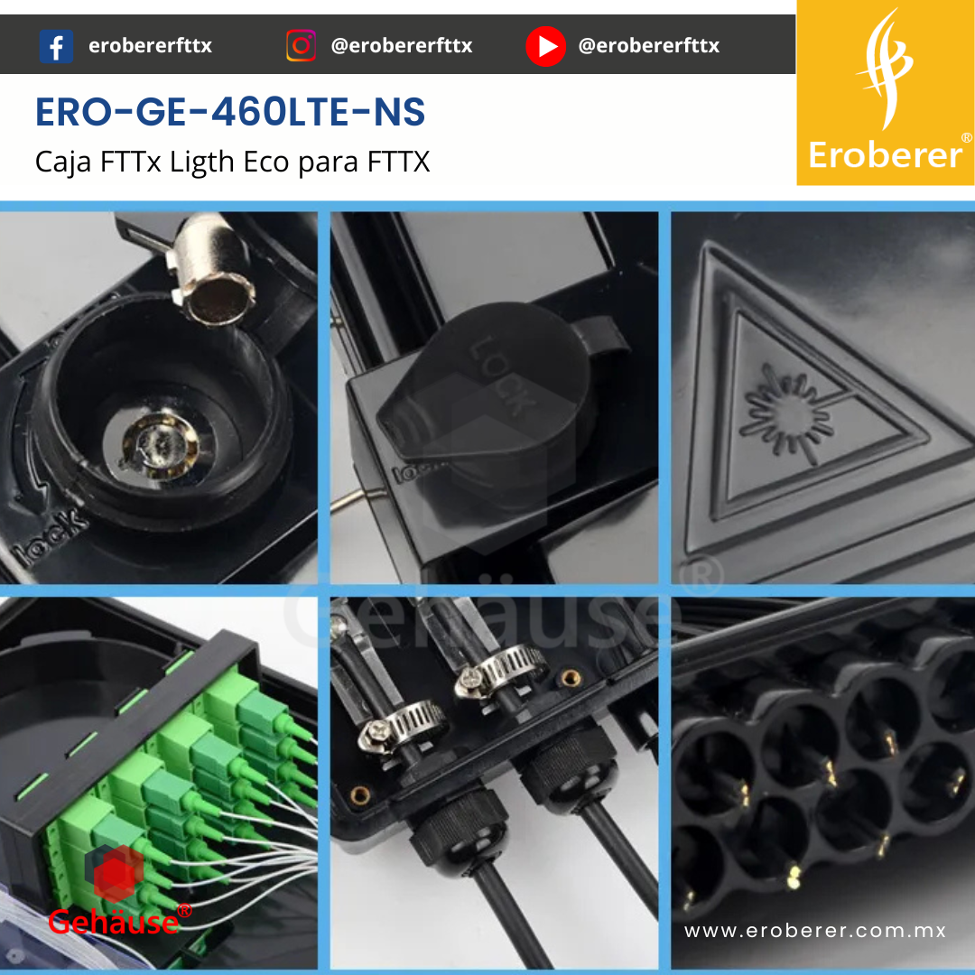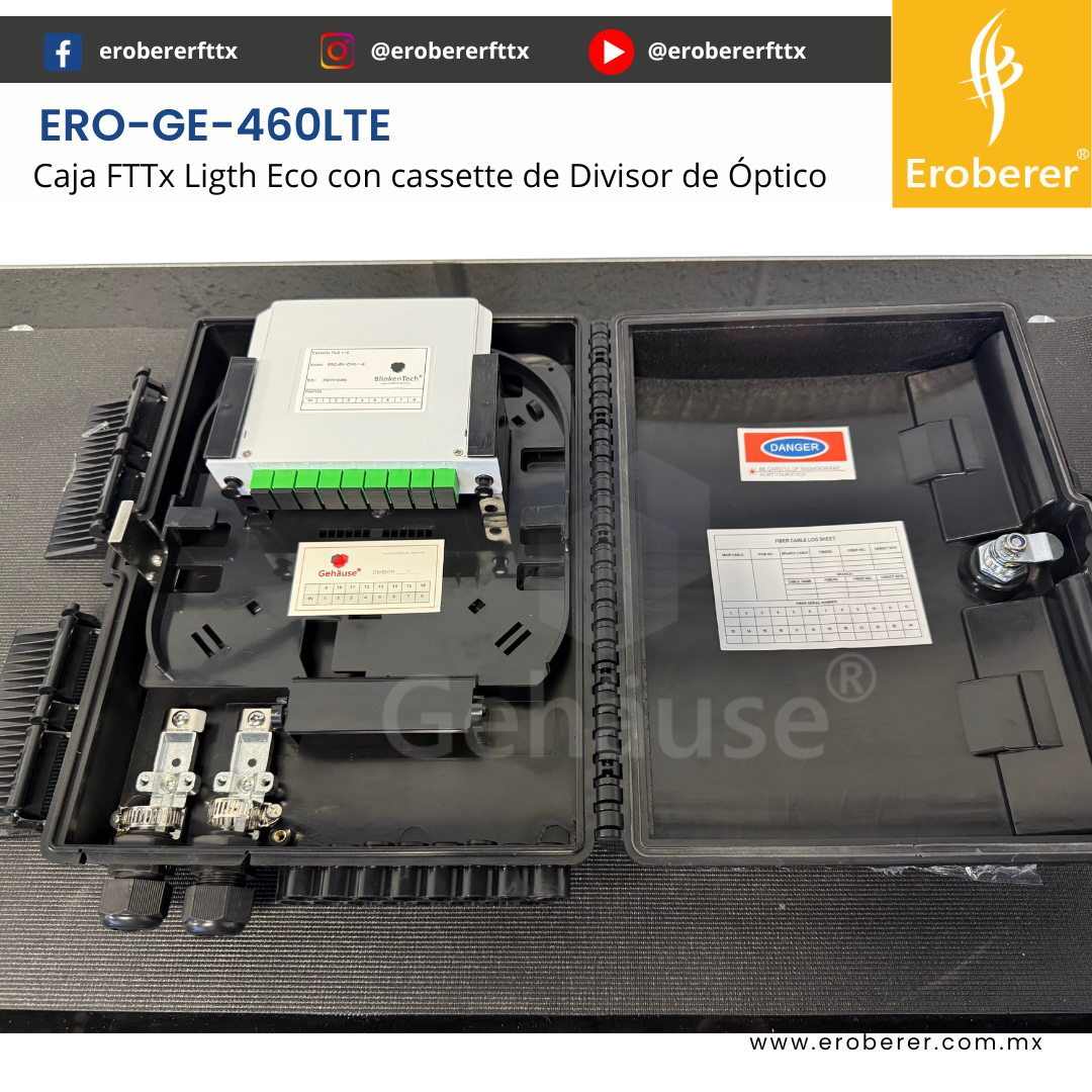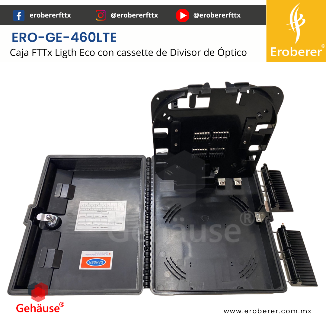 ERO-GE-460LTE-16 La CAJA NAP FTTx 460LTE-16 es una solución todo en uno diseñada para la gestión eficiente de cables de fibra óptica. Integra empalme, fijación, almacenamiento y distribución de forma segura y organizada, ideal para redes FTTH, redes troncales o instalaciones de telecomunicaciones exigentes tanto en interiores como exteriores.
