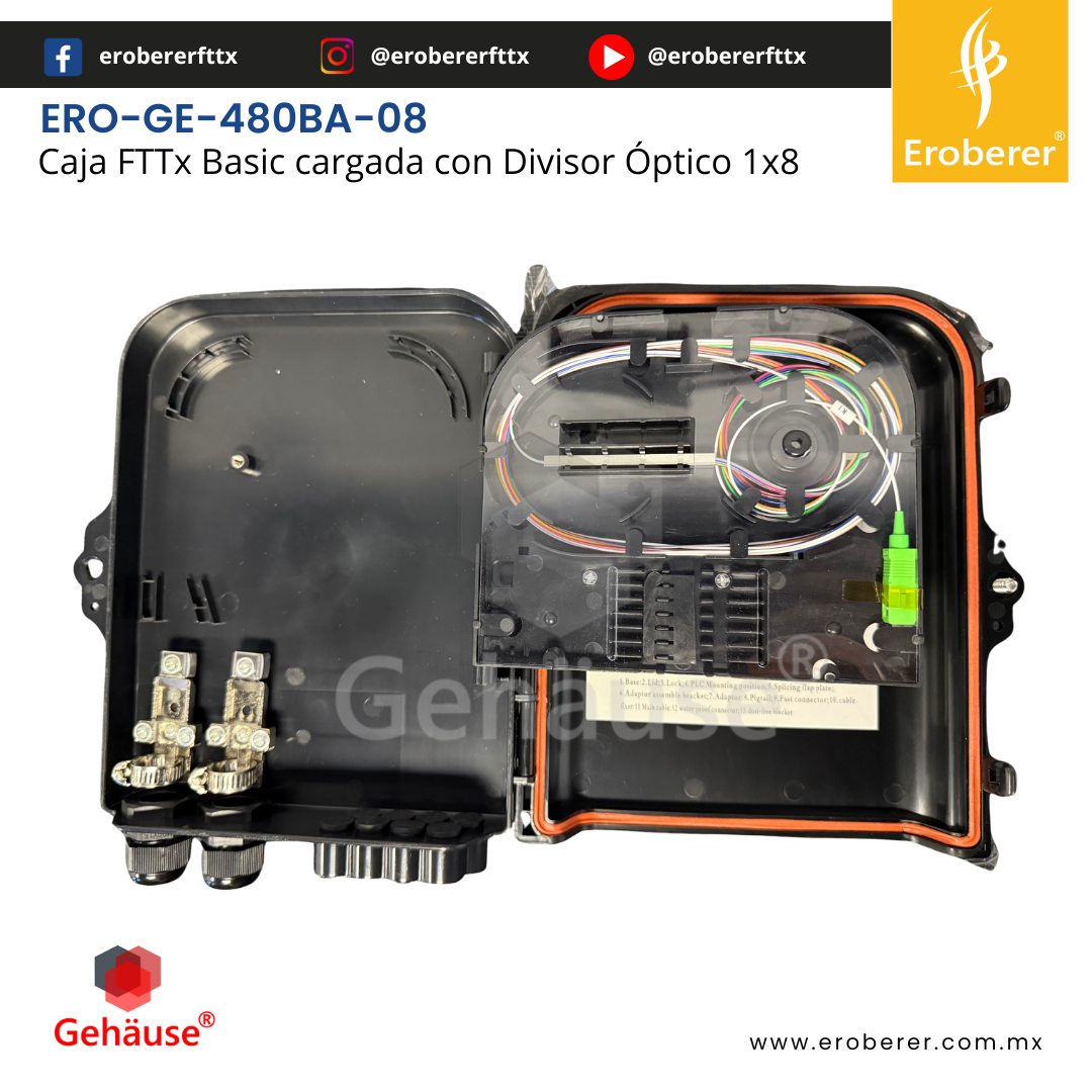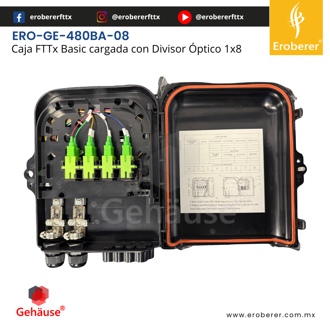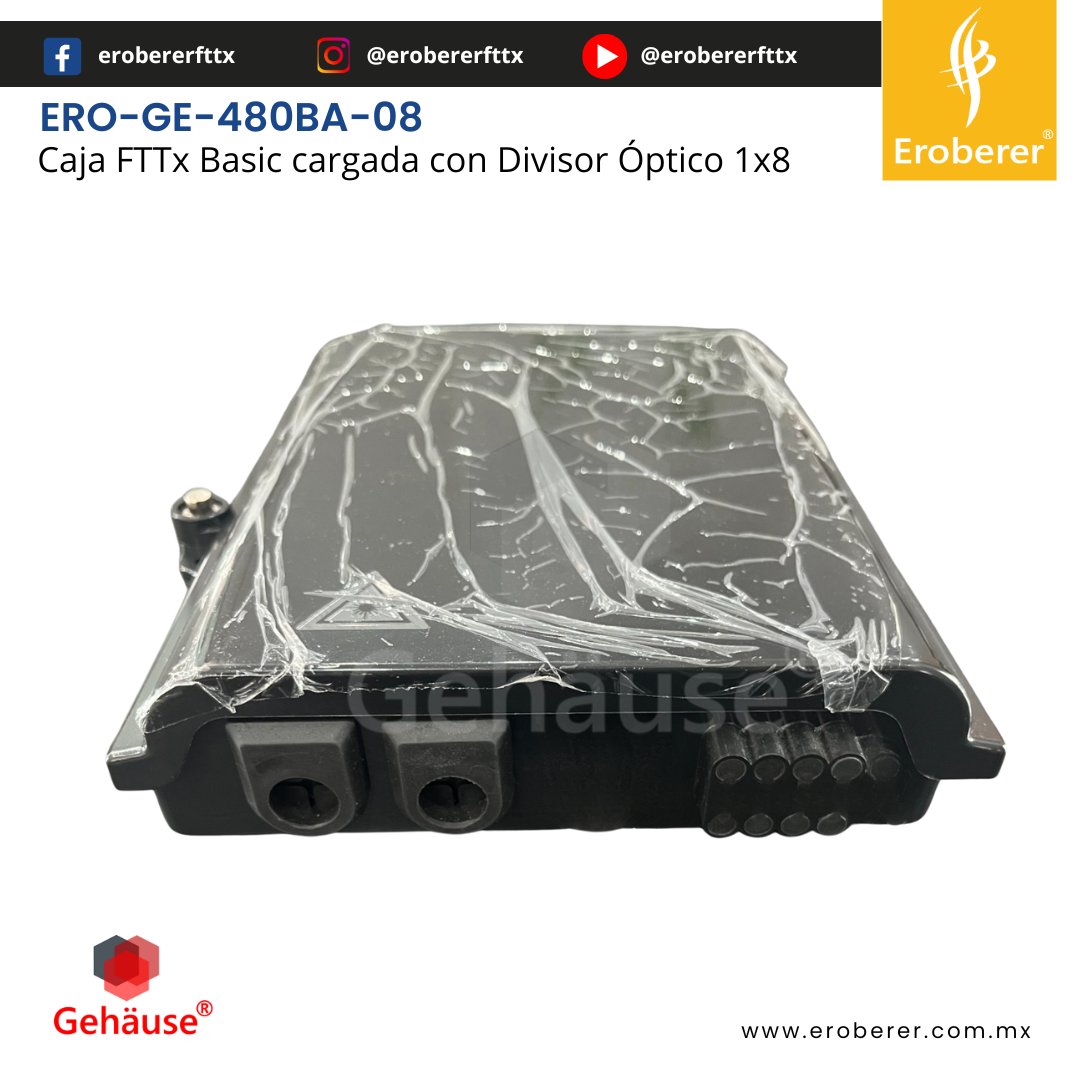 ERO-GE-480BA-08 es una CAJA NAP FTTx de la linea Basica pensada para ser la mejor opción para la terminación de la red FTTx ya que integra opciones en la caja para realizar empalmes, división y cableado de fibra para terminación hacia usuarios.