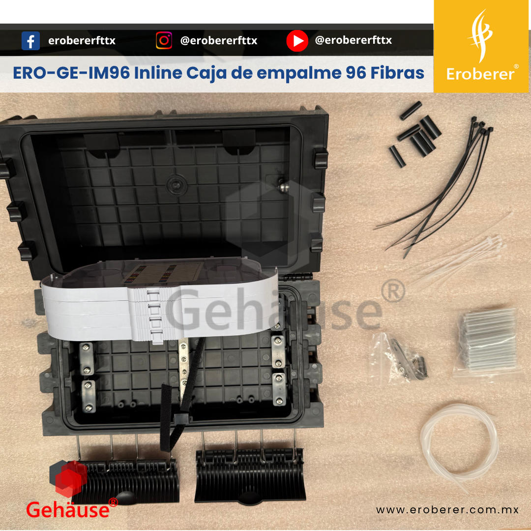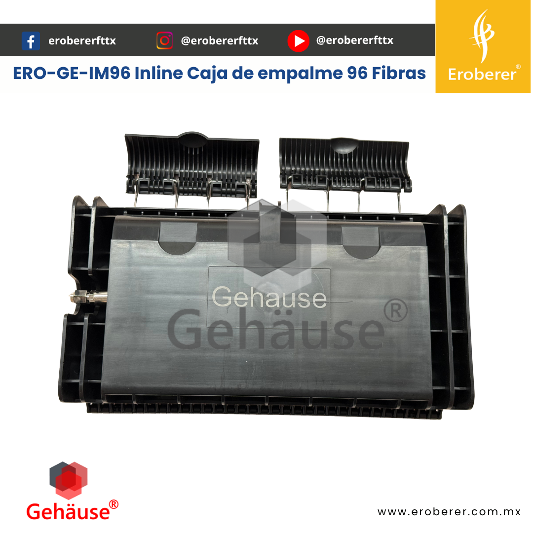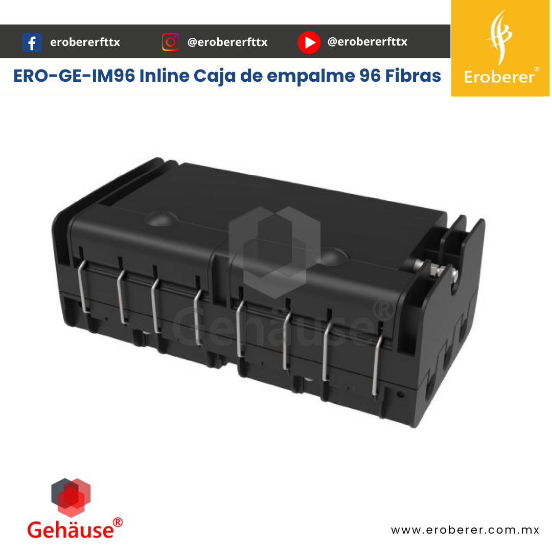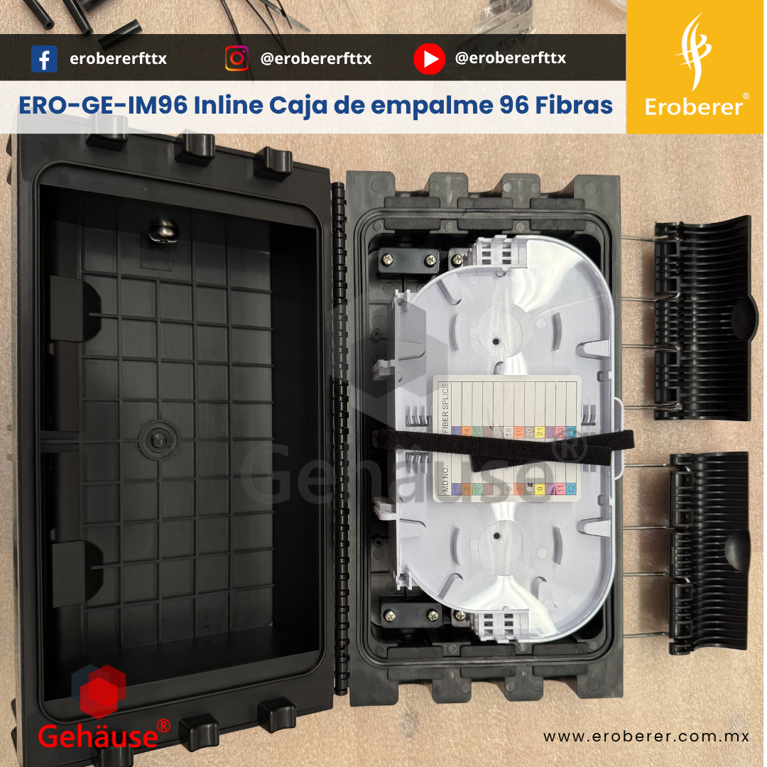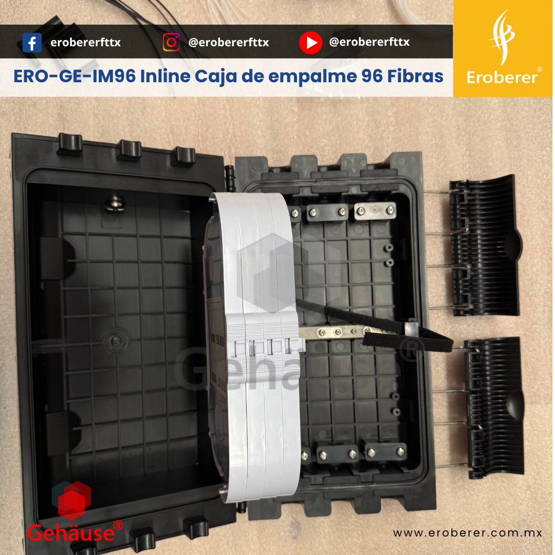 ERO-GE-IM96-Inline La CAJA DE EMPALME IM96-INLINE es una caja de empalme en línea para fibra óptica diseñada para aplicaciones de conexión, derivación y distribución en redes de telecomunicaciones. Con una capacidad máxima de hasta 96 fibras ópticas y un diseño robusto con 6 puertos (3 de entrada y 3 de salida), esta caja es ideal para instalaciones aéreas, subterráneas o en conductos.