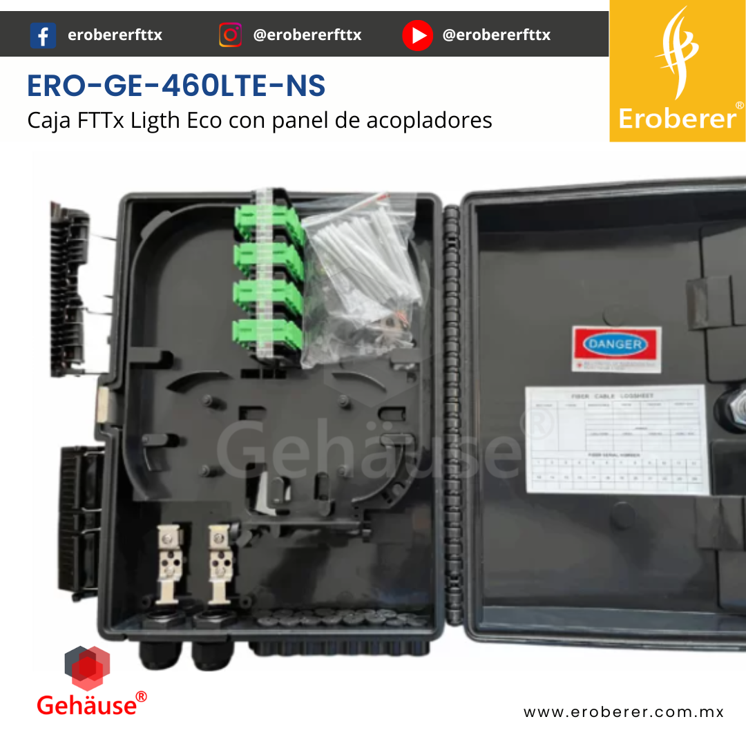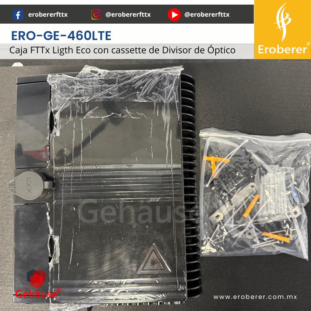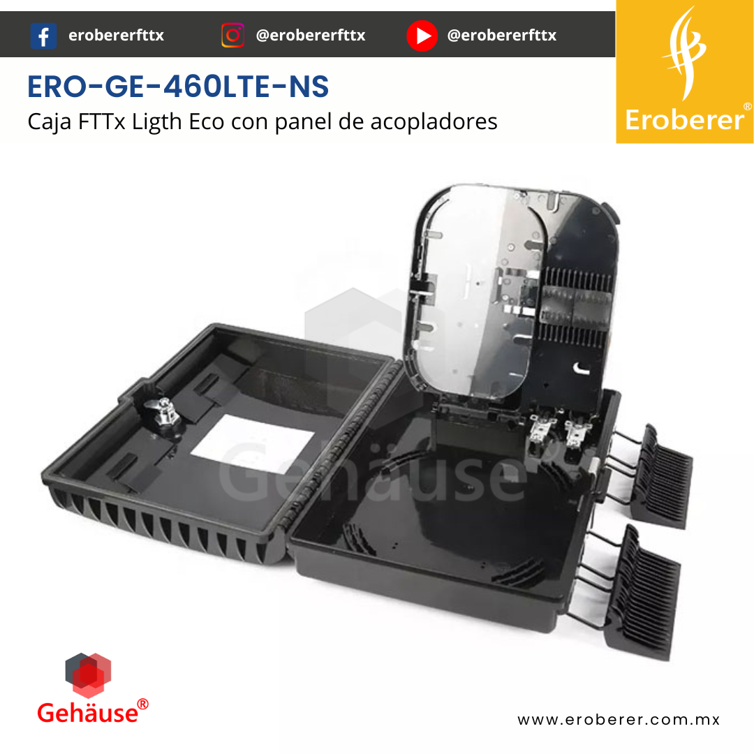 ERO-GE-460LTE-NS La CAJA NAP FTTx 460LTE-NS es una solución diseñada para la gestión eficiente de cables de fibra óptica. Integra empalme, fijación, almacenamiento y distribución de forma segura y organizada, ideal para redes FTTH en el uso de acceso para la instalación de usuarios.