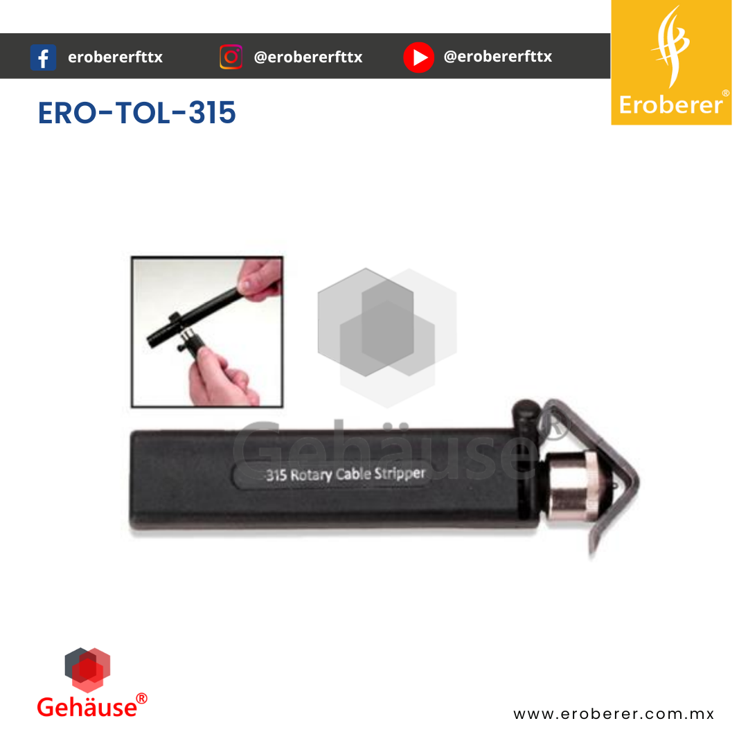 ERO-TOL-315 El CORTADOR CIRCULAR UNIVERSAL TOL-315 es una herramienta profesional ideal para cortar y pelar el aislamiento exterior de cables con recubrimientos como PVC, teflón y THHN, ofreciendo precisión y versatilidad gracias a su cuchilla giratoria que permite realizar cortes circulares, longitudinales y en espiral. Es especialmente útil para abrir ventanas en cables sin dañar los conductores internos.