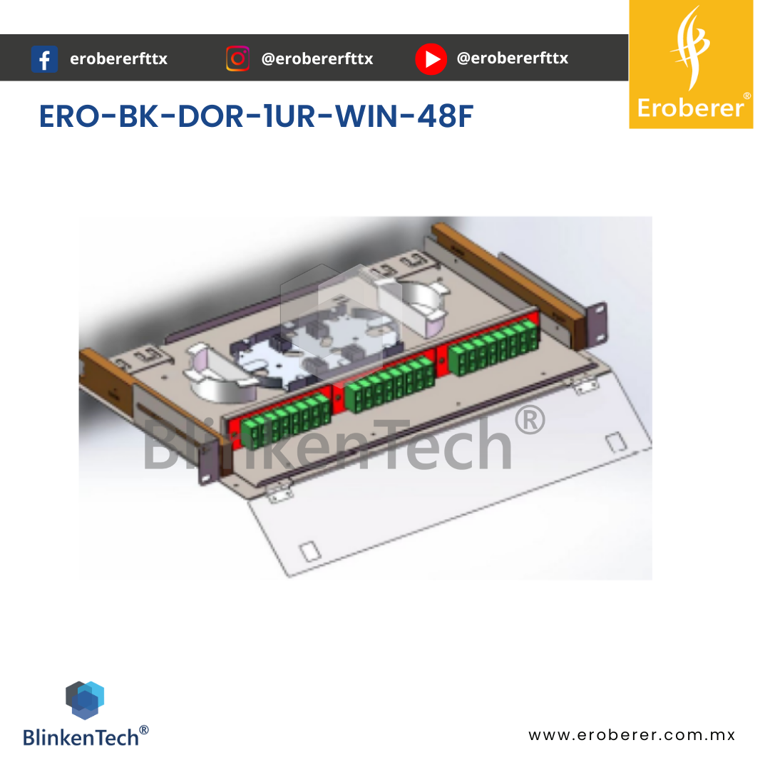 ERO-BK-DOR-1UR-WIN-48F El Distribuidor de Fibra Óptica DOR-1UR-WIN-48F es una unidad compacta y versátil que combina en un solo cuerpo la función de empalme y distribución de fibra óptica. Su diseño tipo cajón deslizable permite un acceso frontal cómodo y eficiente para instalación, mantenimiento y gestión de conexiones.