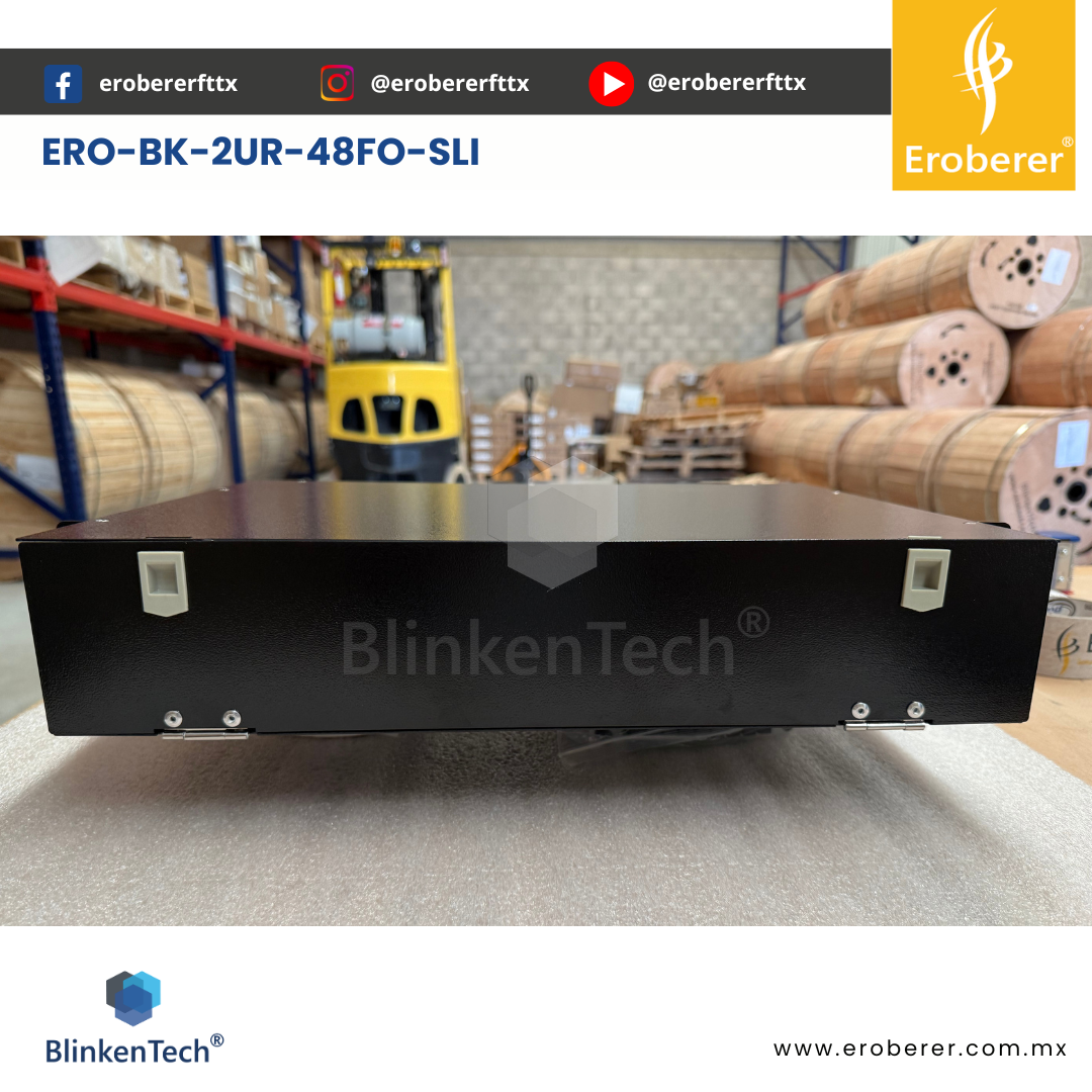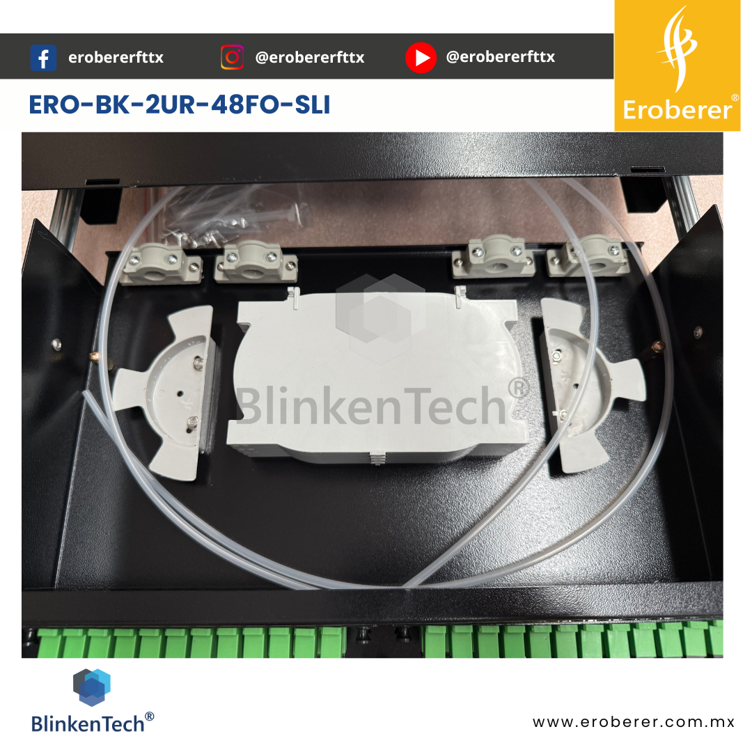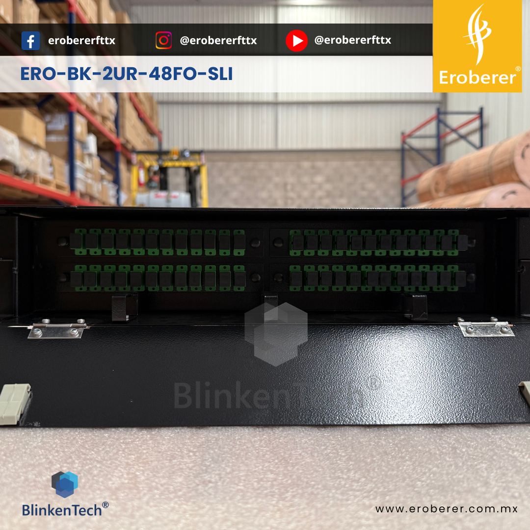 ERO-BK-2UR-48FO-SLI El DISTRIBUIDOR 2UR-48FO-SLI es un marco de distribución de fibra óptica diseñado para organizar, interconectar y derivar cables de fibra en entornos profesionales de telecomunicaciones y redes. Fabricado en acero laminado en frío de 1,2 mm, cuenta con puerta frontal de panel acrílico y puerta trasera de acero para una mayor protección. Su diseño está optimizado para controlar el radio de curvatura y así evitar pérdidas ópticas adicionales. Compatible con racks de 19” y 23”, soporta hasta 48 fibras SC simplex o 96 fibras LC dúplex, siendo ideal para almacenamiento, distribución y gestión de conexiones ópticas en interiores.