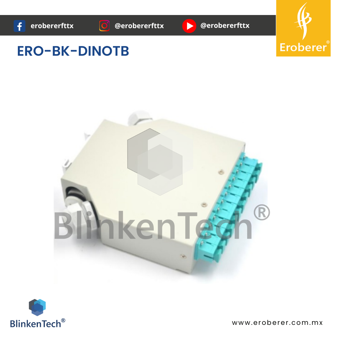 ERO-BK-DINOTB EL Distribuidor de fibra óptica para carril DIN es un dispositivo compacto y funcional diseñado para facilitar la distribución y conexión de fibras ópticas en redes de pequeño y mediano tamaño. Su estructura en aluminio con pintura electrostática ofrece durabilidad y resistencia en aplicaciones exigentes.