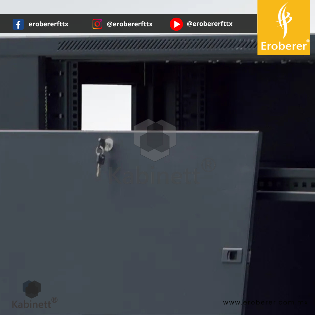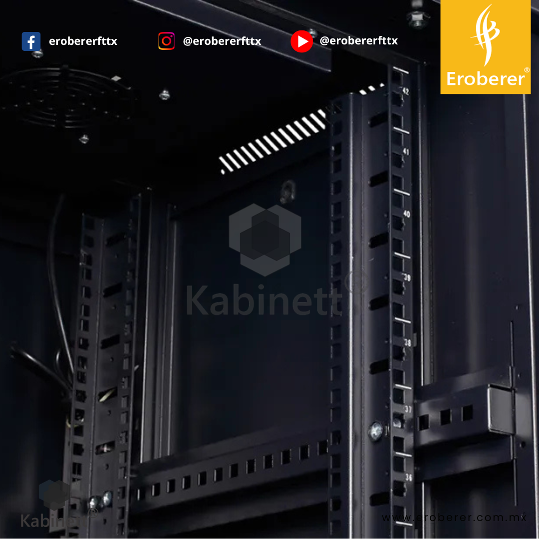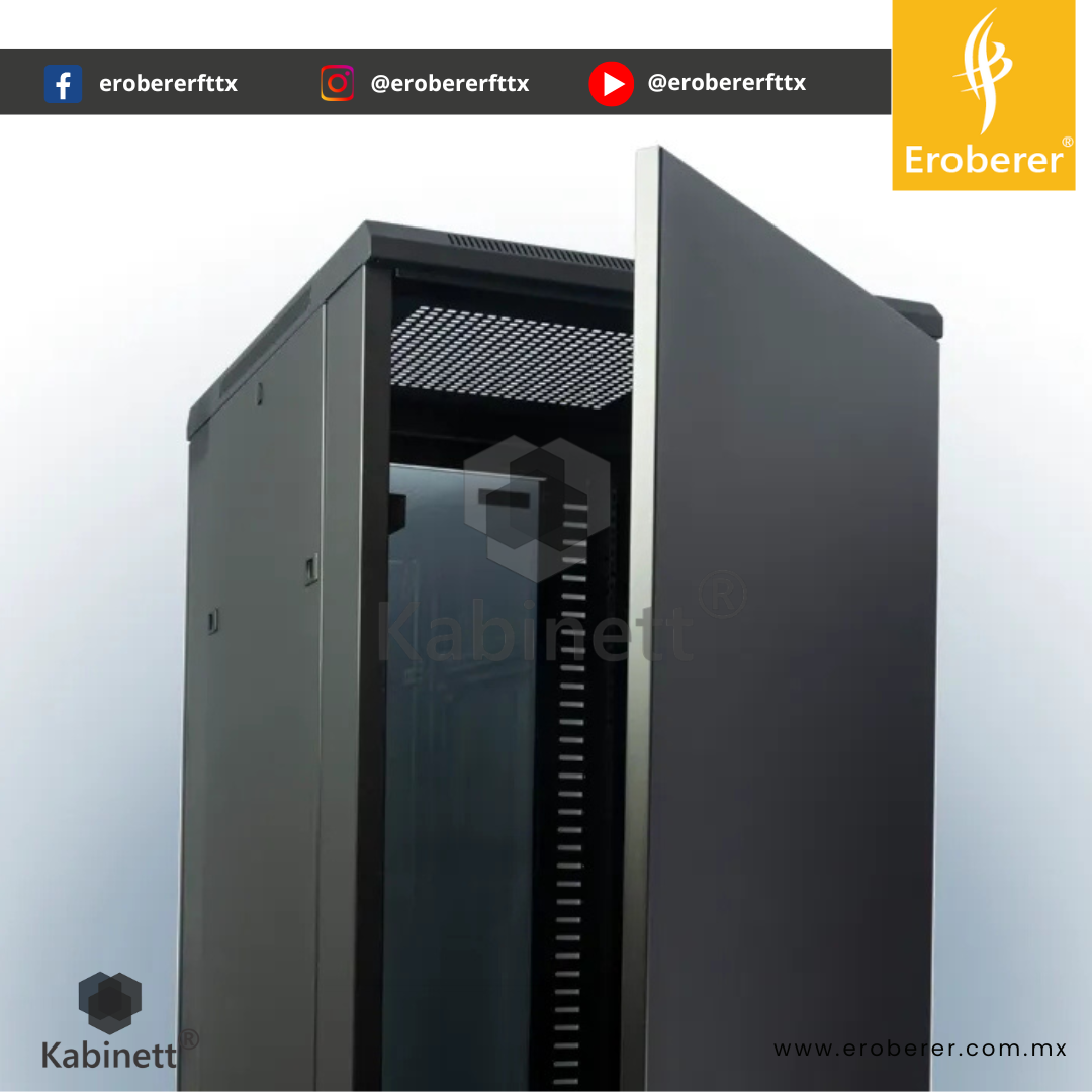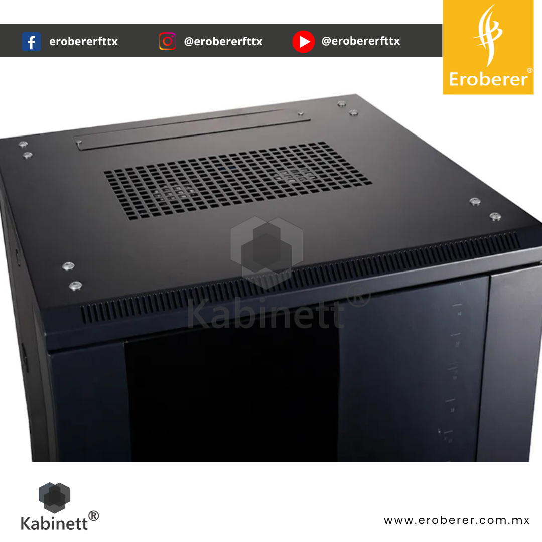 Cuenta con puerta frontal con mirilla de cristal, que permite visualizar los equipos sin abrir el gabinete, y puerta trasera para un manejo sencillo del cableado y ventilación adecuada. Su techo ventilado con accesos para cableado mejora el flujo de aire interno y la organización.