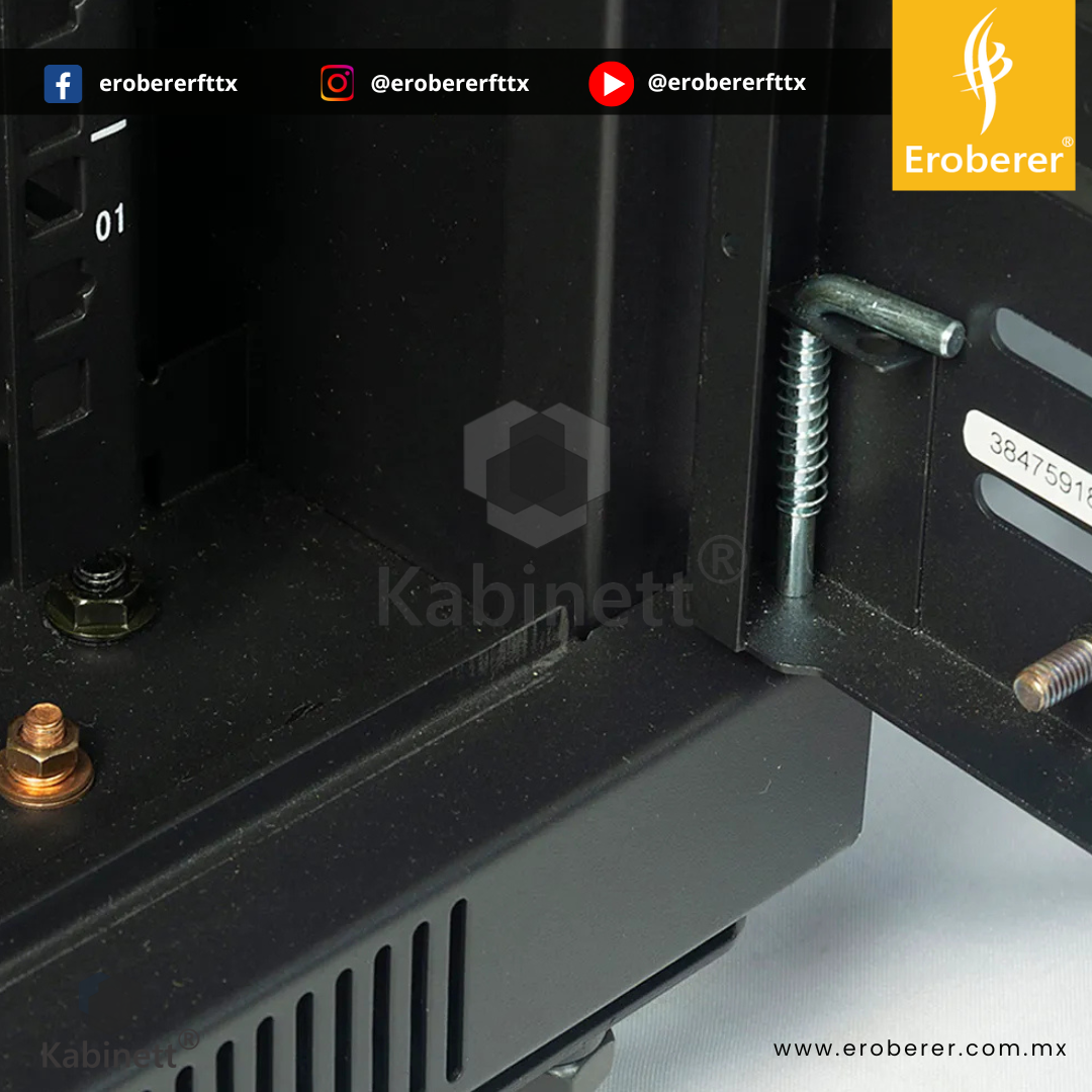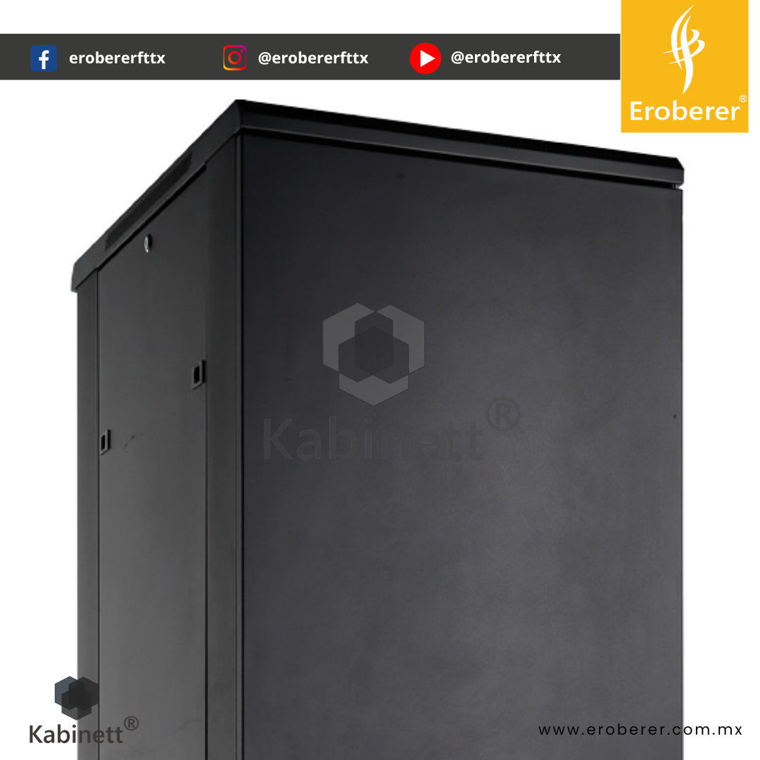 Fabricado bajo las normas EIA-310D y NEMA1, este gabinete tiene un acabado en pintura electrostática color negro y está diseñado exclusivamente para uso en interiores con ambiente controlado, evitando su instalación en exteriores o zonas con humedad.
