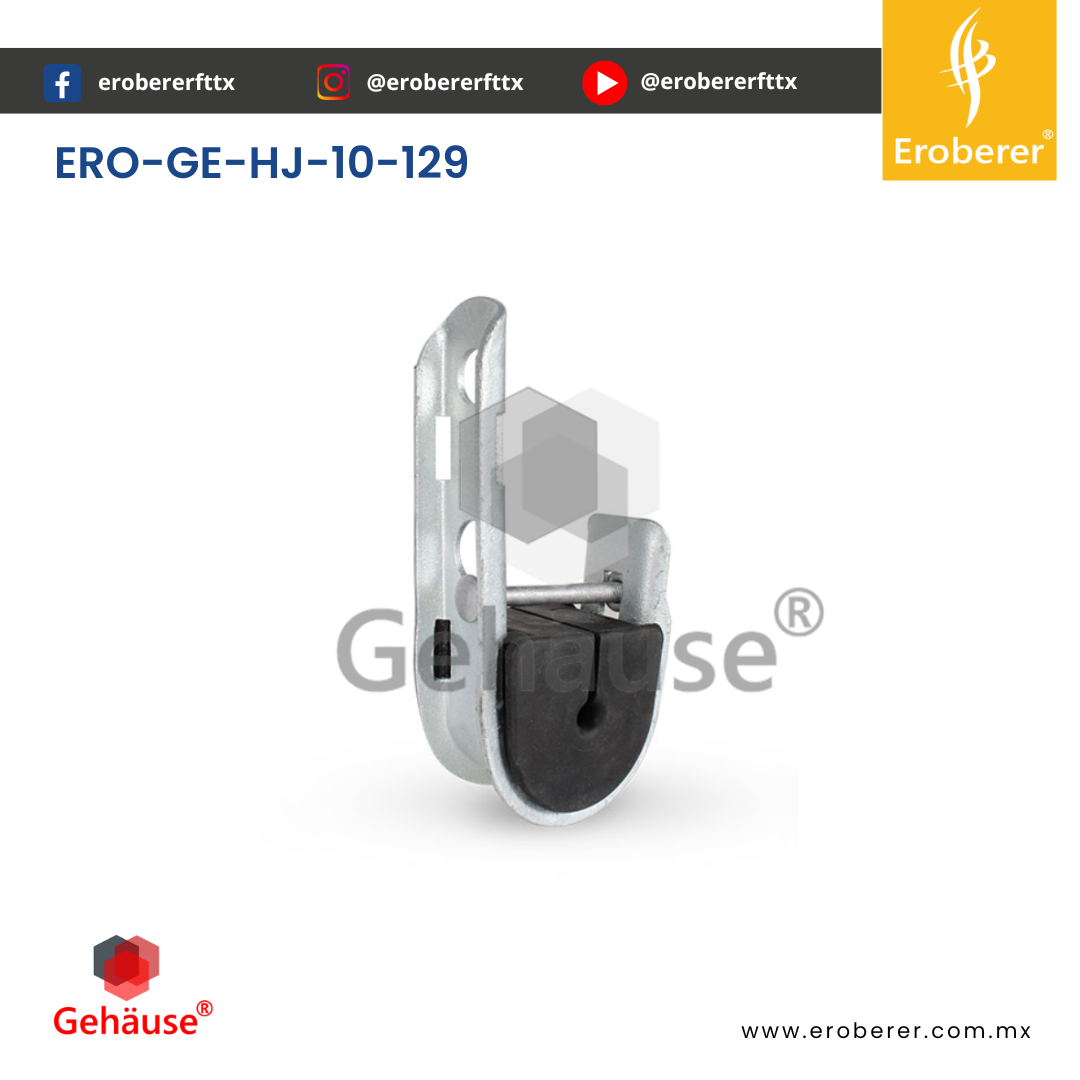 El ERO-GE-HJ-10-129 Mod. HERRAJE TIPO J HJ-10-129 especializado para cables de fibra óptica ADSS de 10 a 12.9 mm. Su cuerpo robusto en acero A-36 galvanizado ofrece una excelente resistencia mecánica para entornos expuestos.