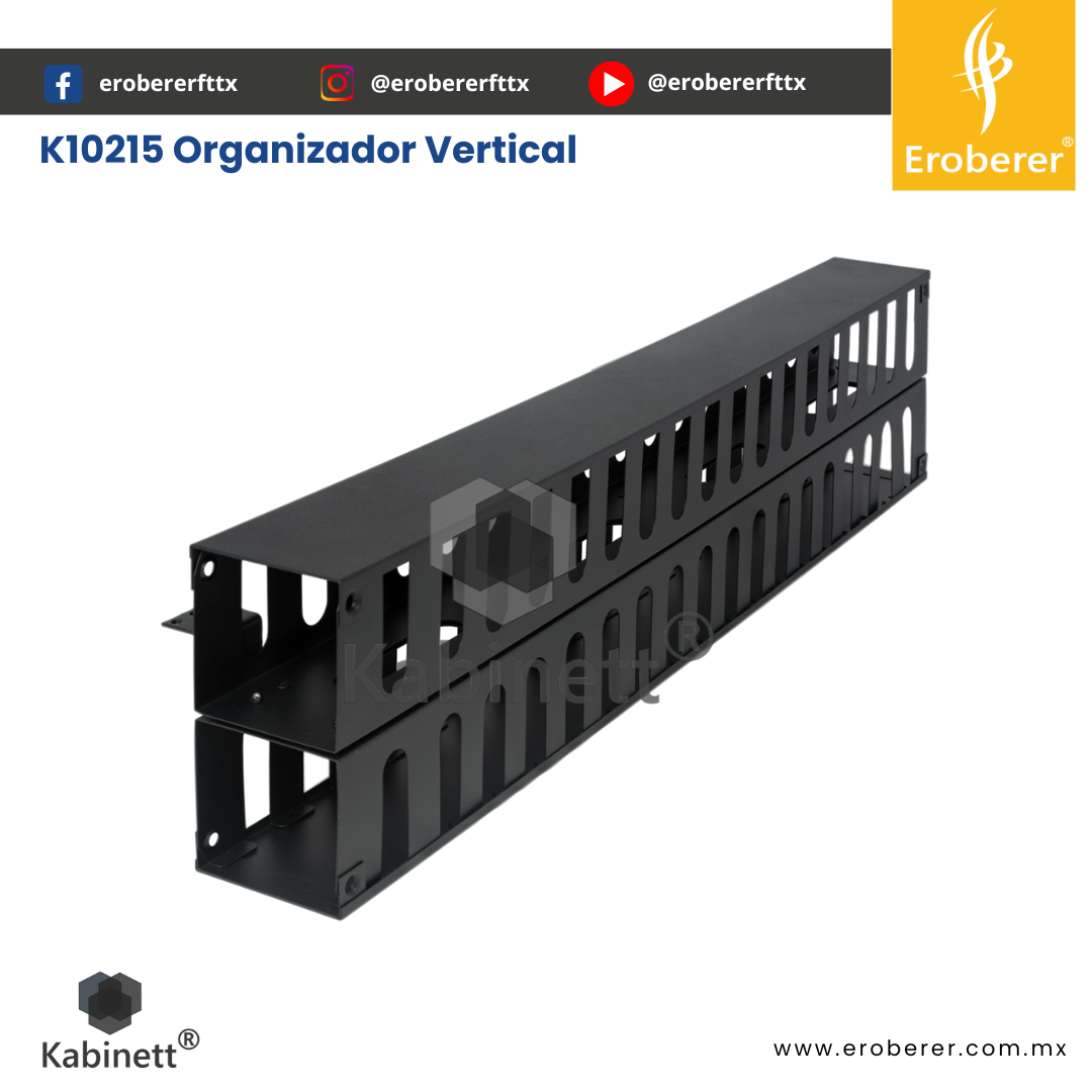 ERO-KA-K10215 El ORGANIZADOR k10215 es un modelo metálico doble de 22UR, diseñado para ofrecer el doble de capacidad de organizacion de cables en comparación con un organizador sencillo. Fabricado en lámina de acero calibre 18, acabado en pintura electrostática negra semimate, combina durabilidad y alta capacidad. Su diseño doble permite separar y organizar grandes volúmenes de patch cords o troncales de forma clara y eficiente, cumpliendo con la norma EIA-310D para montaje en racks.