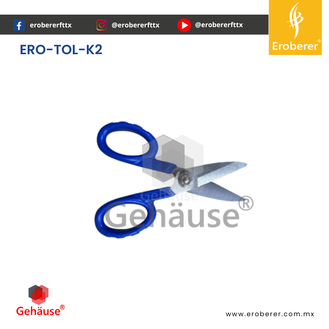 ERO-TOL-K2 Las TIJERA PARA KEVLAR TOL-K2 son herramientas de alta precisión diseñadas para cortar aramida o kevlar en cables de fibra óptica, cables drop FIG. 0 y jumpers en instalaciones de FTTH. Ideales para tareas en redes FTTH y otras aplicaciones de campo, estas tijeras livianas e ideales para múltiples tareas gracias a sus mangos moldeados ergonómicamente con gran comodidad, cuentan con materiales y una estructura impecable.